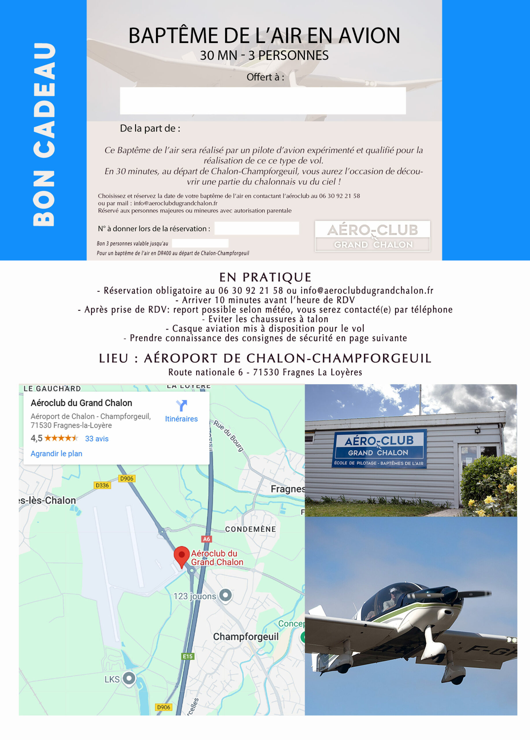 Vous ou la personne destinataire pourrez ensuite prendre rendez-vous auprès de l’aéroclub pour organiser le baptême en téléphonant au 06 30 92 21 58